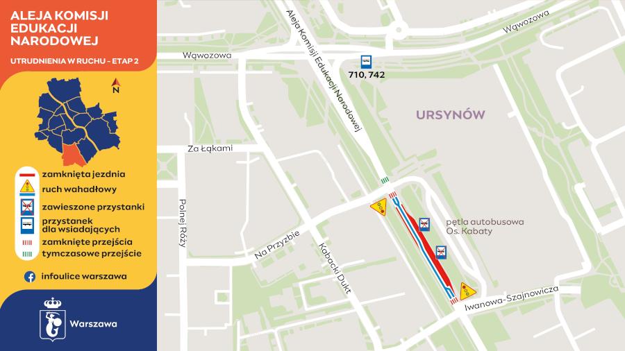 Wraz z ogrodzeniem terenu budowy likwidowana jest zatoka autobusowa przy Alei Komisji Edukacji Narodowej. Pasażerowie autobusów linii 710 i 742 muszą przesiąść się na inne przystanki:
